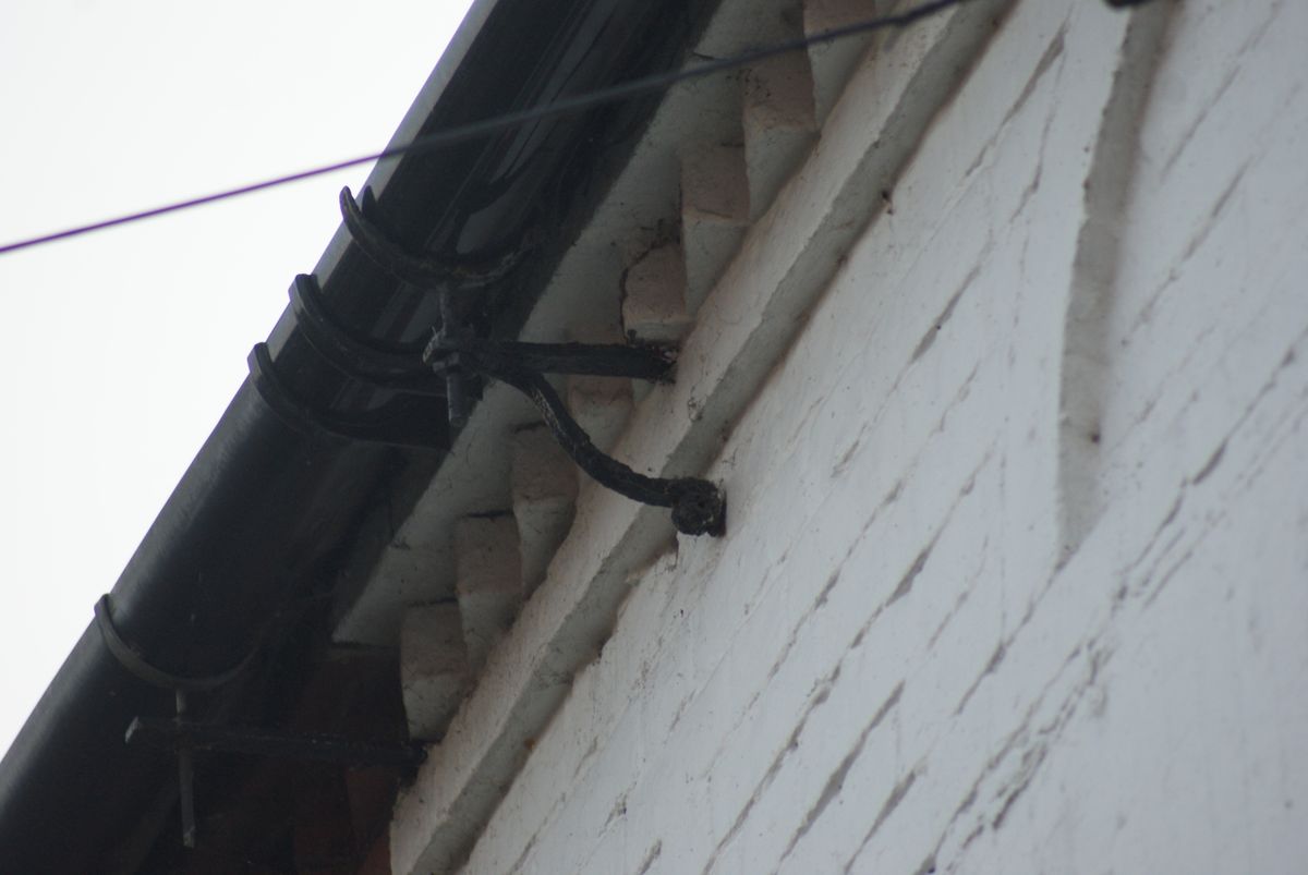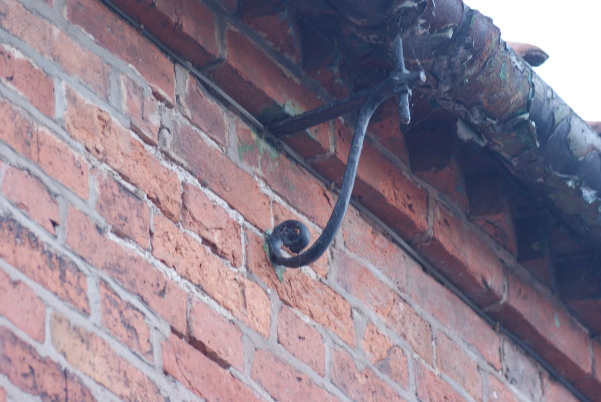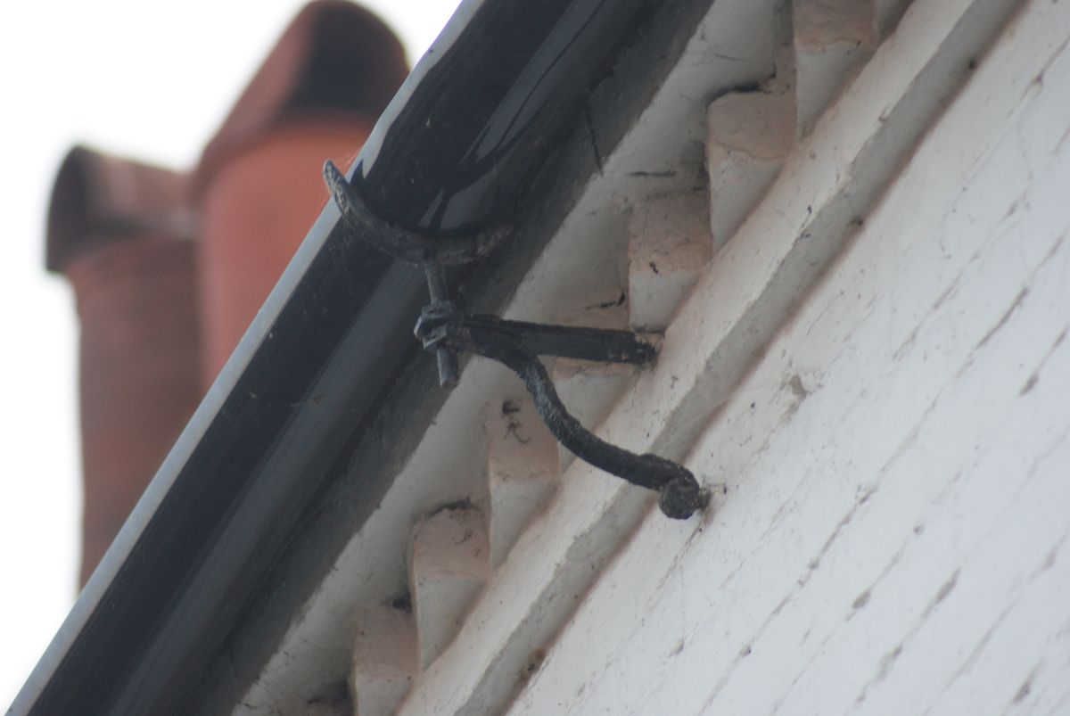 The first rainwater metal gutter brackets I came across were holding up some beefy cast iron guttering. At first sight they looked original. However, when I zoomed in it became obvious they were reproductions — yet reproduced with care; please see images 1–3. The smith who created these sturdy gutter brackets had even gone the extra mile, fabricating their own threaded connecting bar. By die, as it looks — there’s no tell-tale sign at the end of the bar that would indicate a thread cut single-point on a lathe.