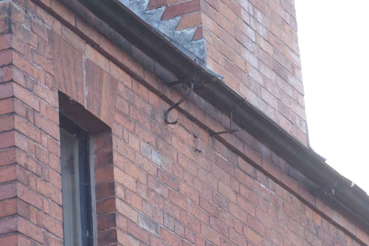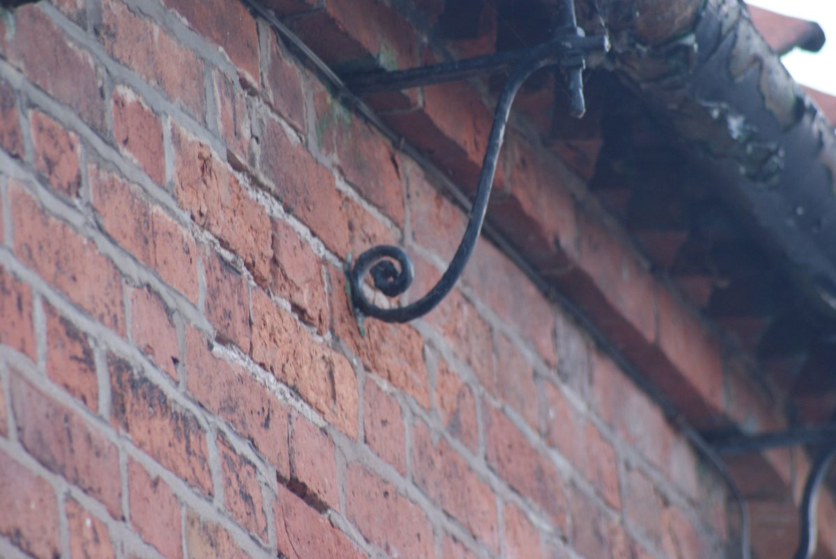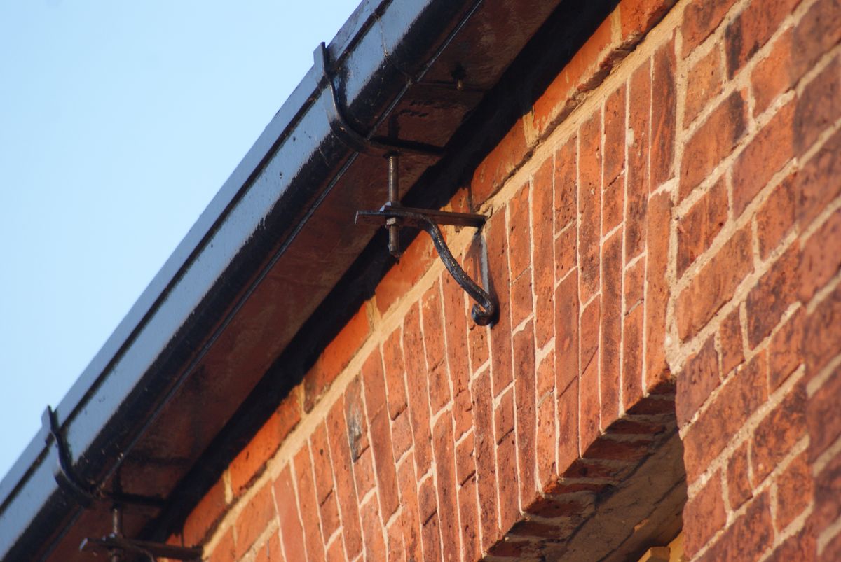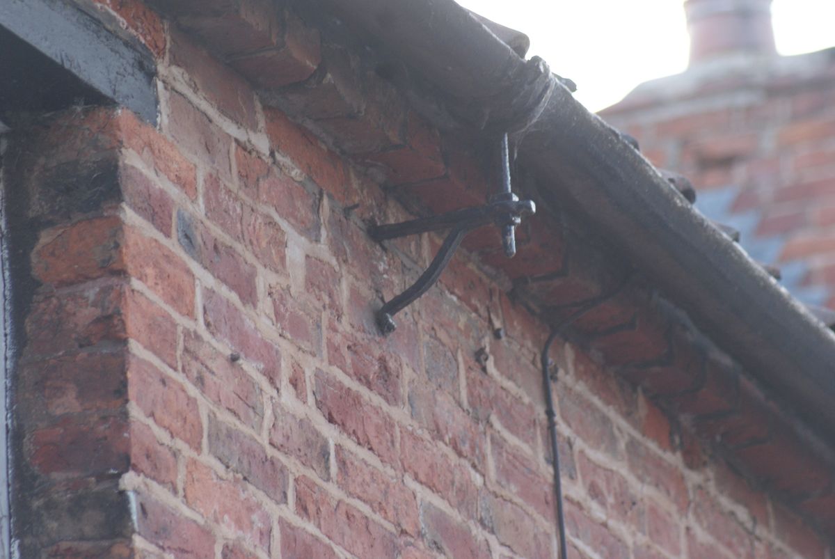 The first rainwater metal gutter brackets I came across were holding up some beefy cast iron guttering. At first sight they looked original. However, when I zoomed in it became obvious they were reproductions — yet reproduced with care; please see images 1–3. The smith who created these sturdy gutter brackets had even gone the extra mile, fabricating their own threaded connecting bar. By die, as it looks — there’s no tell-tale sign at the end of the bar that would indicate a thread cut single-point on a lathe.
