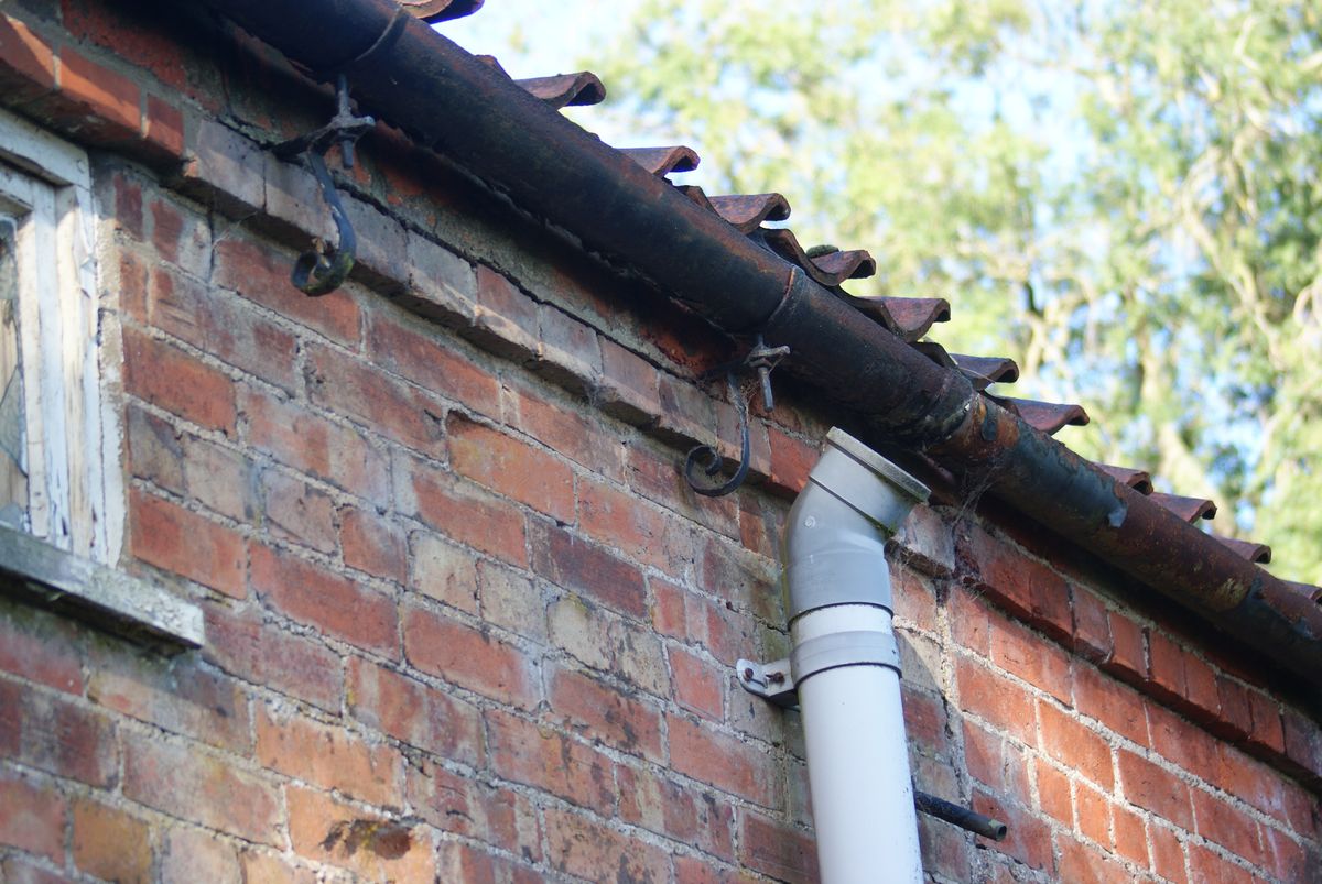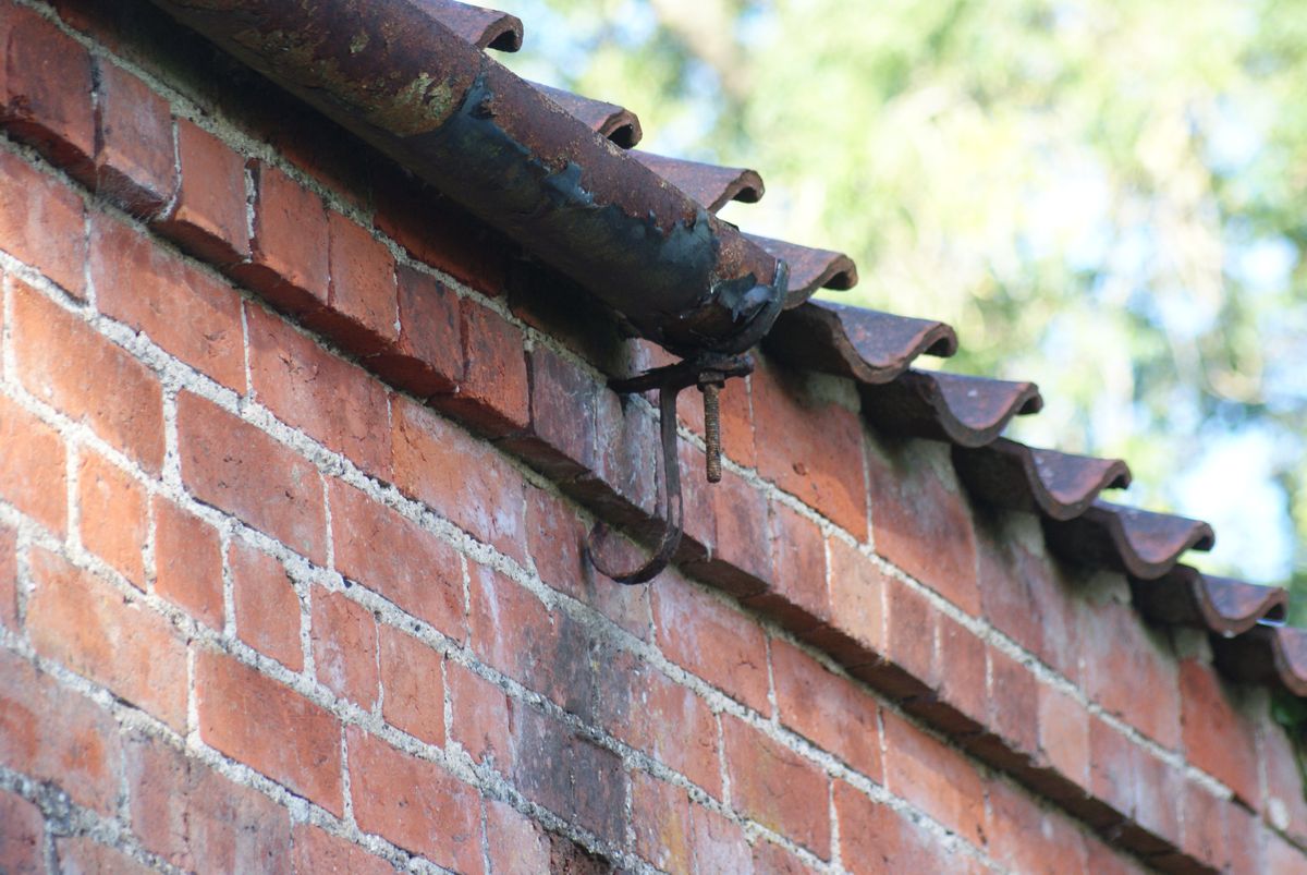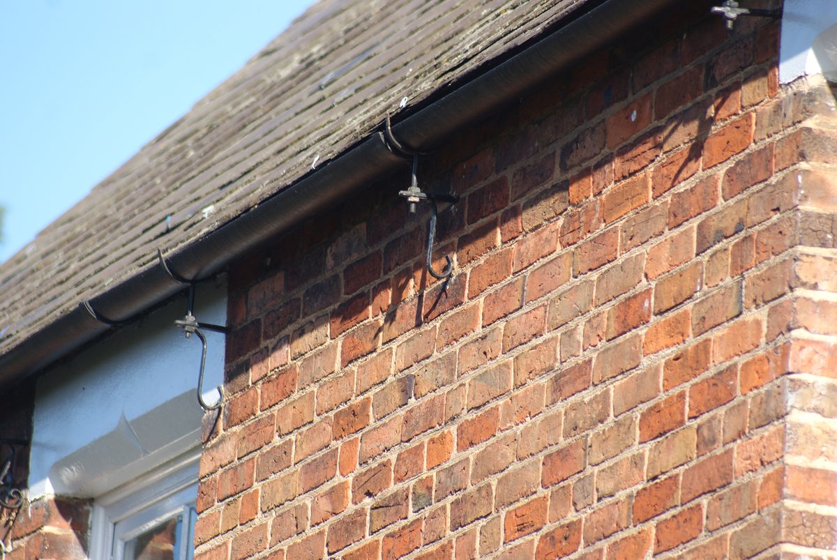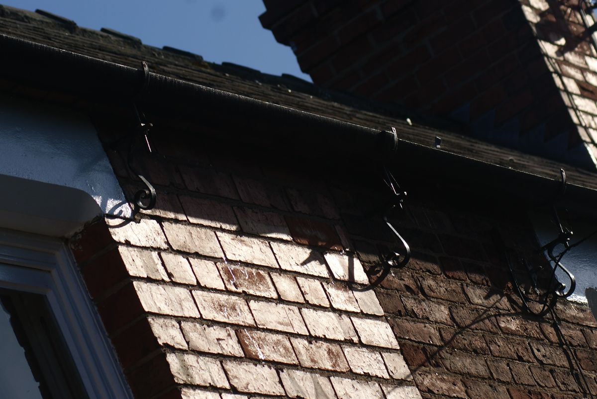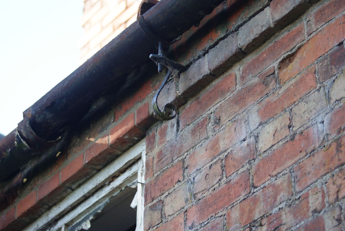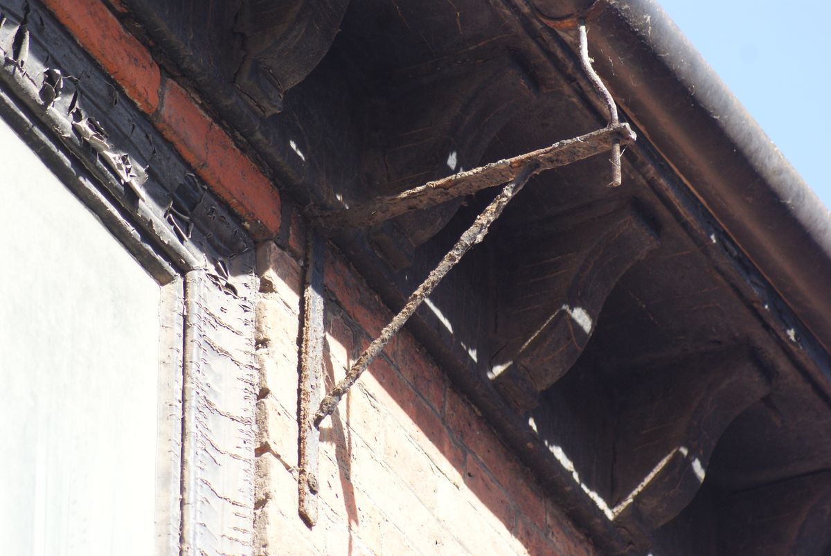 Interestingly, it was these very decorative brackets that first piqued my curiosity into the form, function, and regional styles of metal rainwater brackets. I remember vividly — lining up to take my children into primary school — watching workmen restore the roof and reuse the brackets you see in image 5. The cottages next door to this white house also have a similar scrolled bracket design, only older (images 7–8). You can tell by the square nuts supporting the threaded bar, rather than the six-sided variety used on the white house.