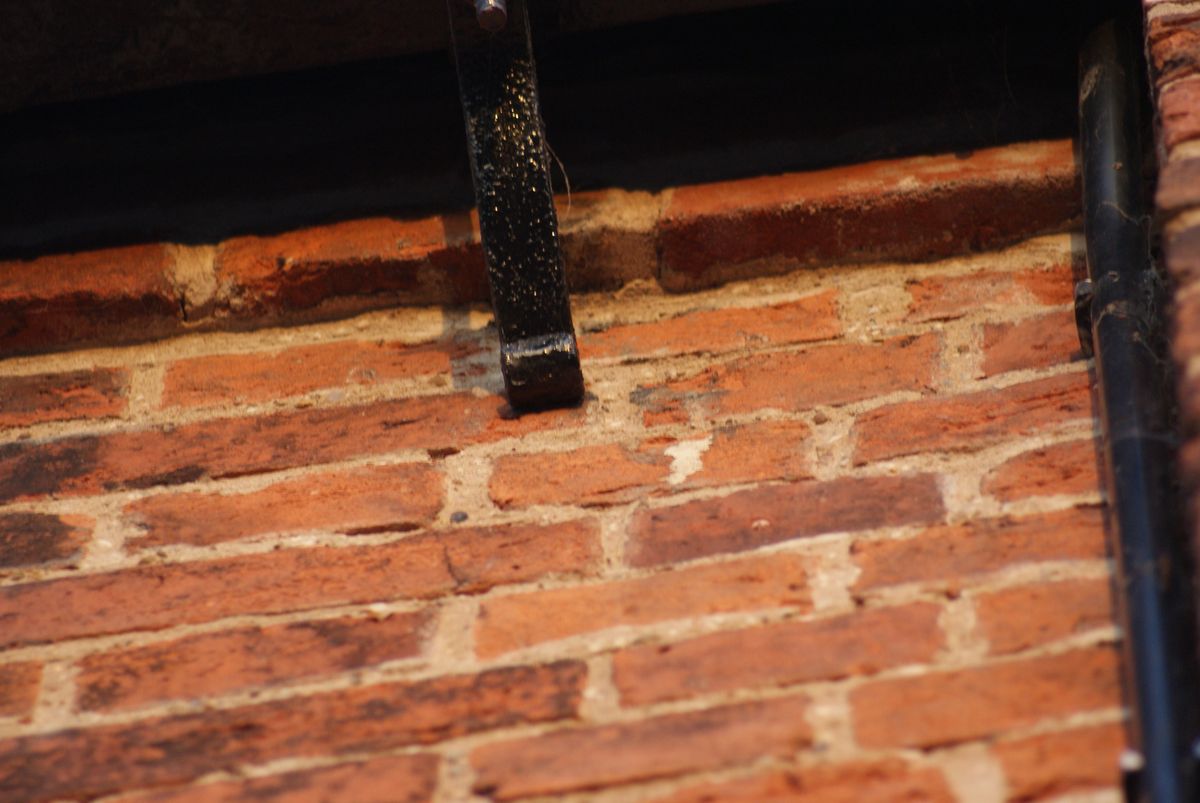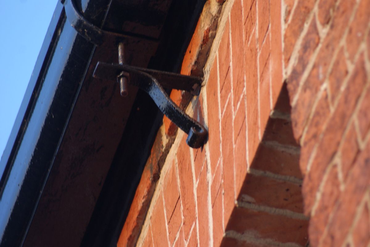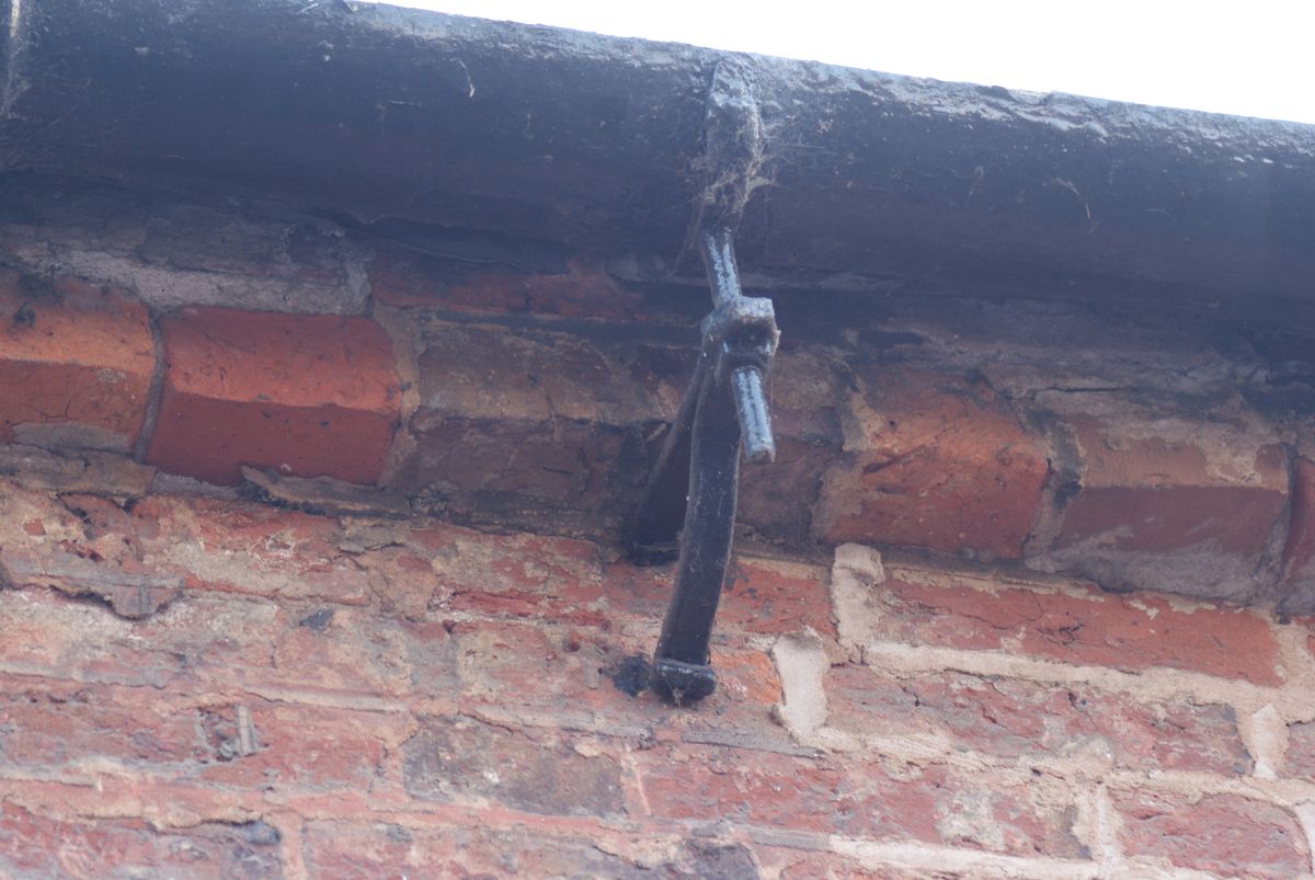 The first rainwater metal gutter brackets I came across were holding up some beefy cast iron guttering. At first sight they looked original. However, when I zoomed in it became obvious they were reproductions — yet reproduced with care; please see images 1–3. The smith who created these sturdy gutter brackets had even gone the extra mile, fabricating their own threaded connecting bar. By die, as it looks — there’s no tell-tale sign at the end of the bar that would indicate a thread cut single-point on a lathe.