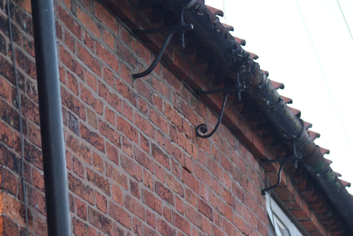 Along Station St I was gifted with a couple of lovely examples of both a handmade blacksmith’s gutter bracket and an array of early factory-made samples. Images 4–6 are the latter, yet they’re still stunning after 70-plus years of weathering. These gutter brackets were built to last — and last they have. Another interesting feature, also pointed out in the blog about Tuxford’s traditional rainwater collection, is the pattern the original roofers arranged the brackets in: scroll, then foot, then scroll again. But the real icing on the cake for me is the bevelled facing edge of the support. Lovely stuff.
