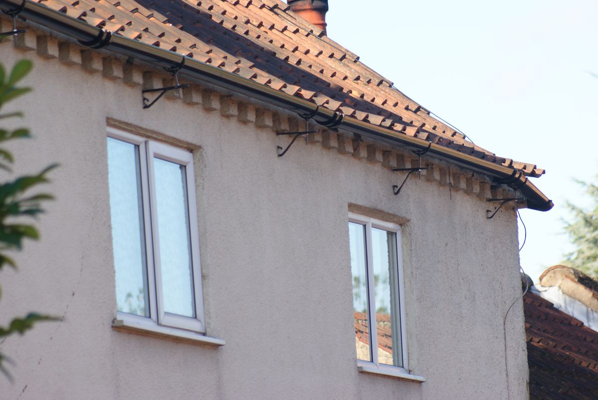 Interestingly, it was these very decorative brackets that first piqued my curiosity into the form, function, and regional styles of metal rainwater brackets. I remember vividly — lining up to take my children into primary school — watching workmen restore the roof and reuse the brackets you see in image 5. The cottages next door to this white house also have a similar scrolled bracket design, only older (images 7–8). You can tell by the square nuts supporting the threaded bar, rather than the six-sided variety used on the white house.